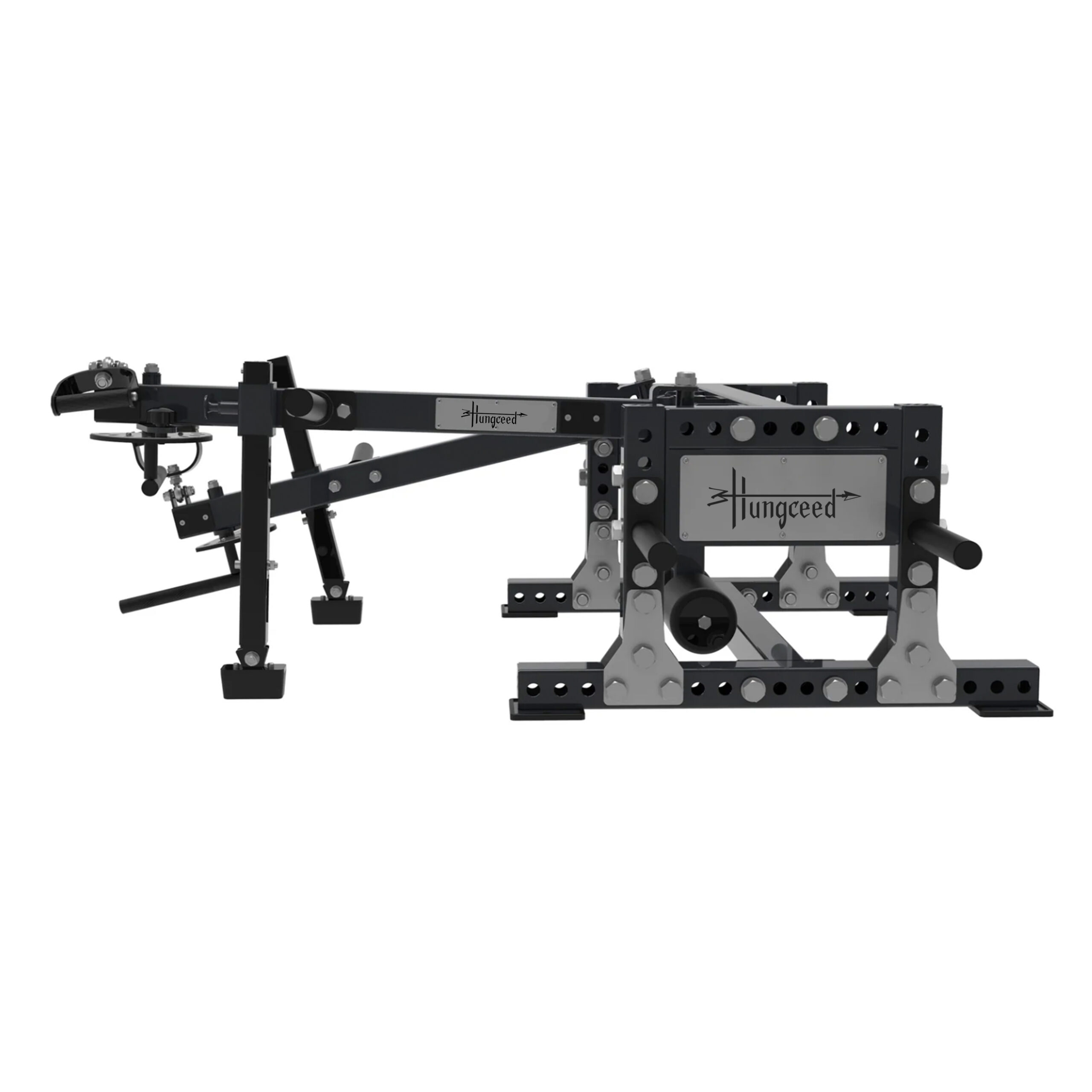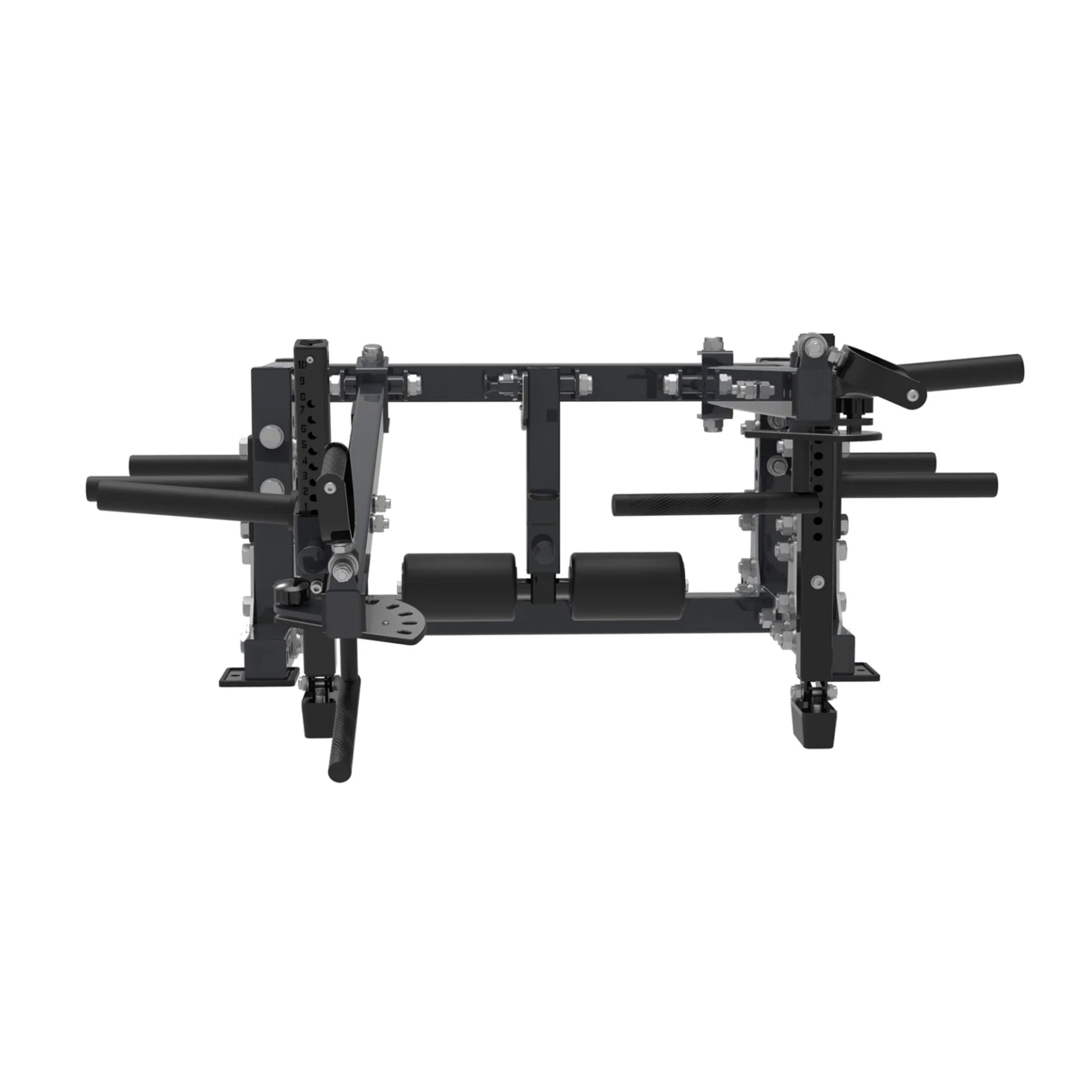 Cada brazo incluye limitadores de rango regulables y un sistema de ajuste por pasador amortiguado, que permite personalizar el recorrido del movimiento con precisión. Además, incorpora un apoyo central acolchado regulable, ideal para ejercicios como split squat o variaciones controladas de sentadillas y zancadas.